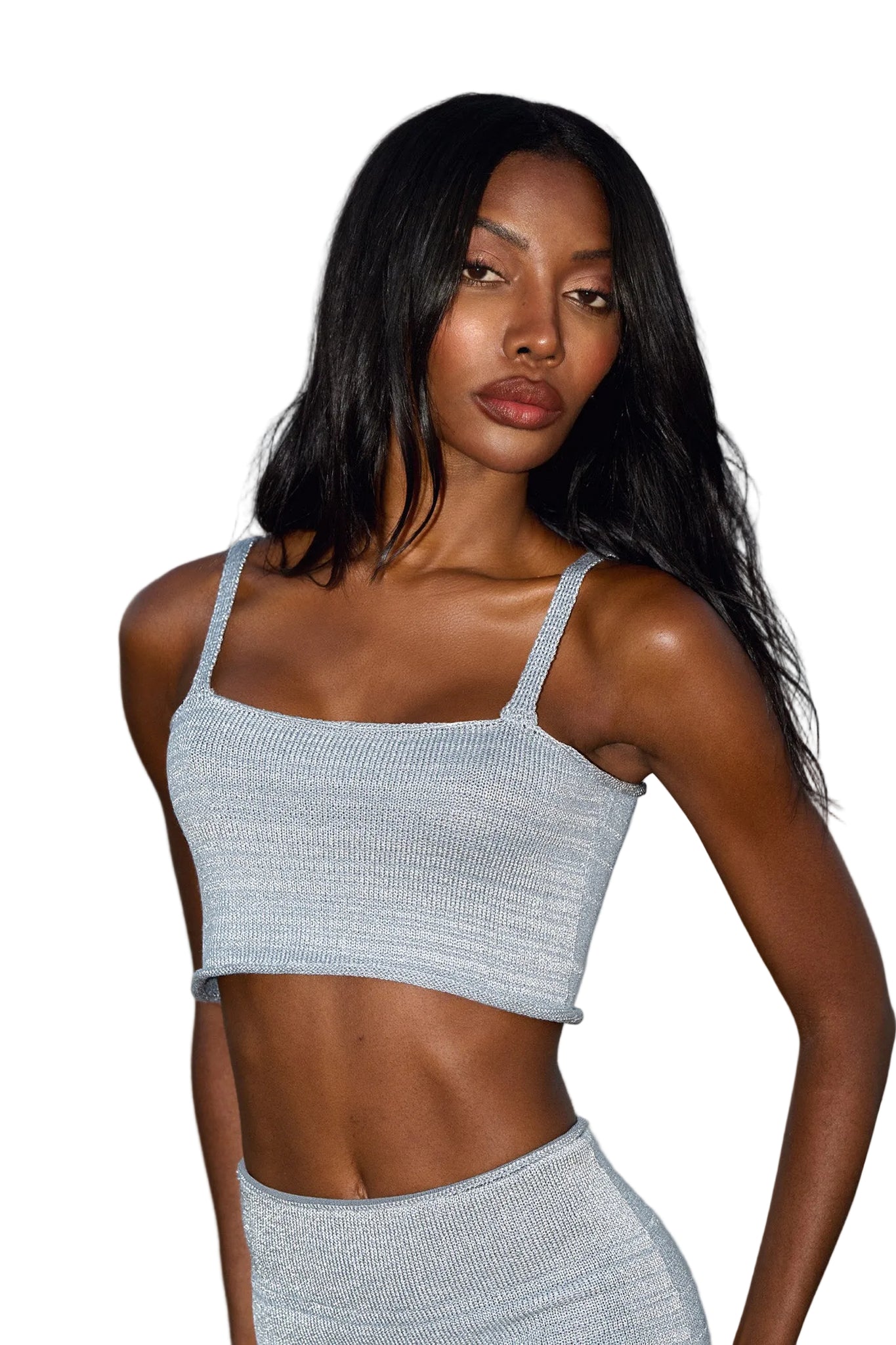 Tali Top matches perfectly with our Lille or Pali Skirts. This fun and flirty top is made from soft metallic and viscose blended yarn.